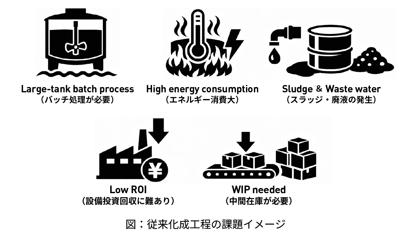 従来の潤滑工程では、大型の処理槽を一定量稼働させることを前提にコスト設計がなされています。そのため、生産量が少ない状態では経済合理性という面で不利になります。