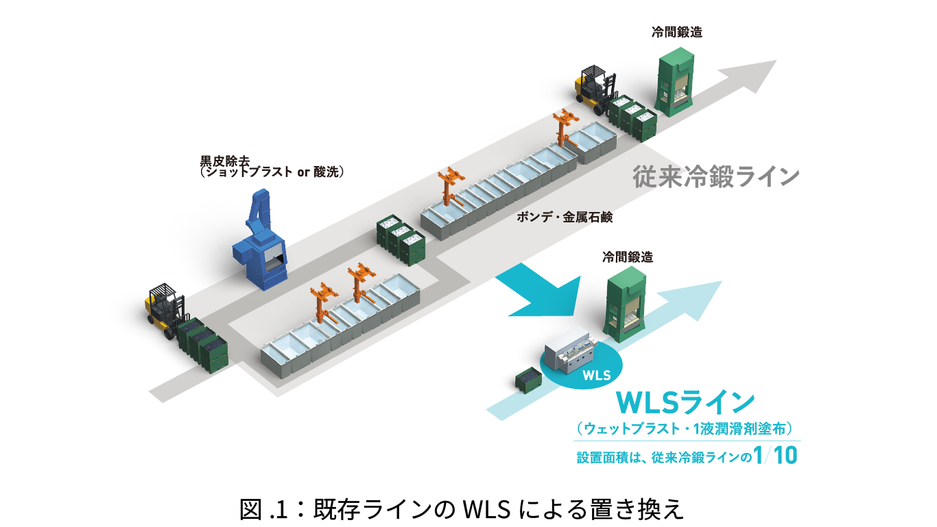 一方、WLSでは潤滑工程に大きな処理槽を必要とせず、1液のスプレー塗布&乾燥のみで構成しているため、生産量の変動があっても合理性を大きく損なうことがありません。