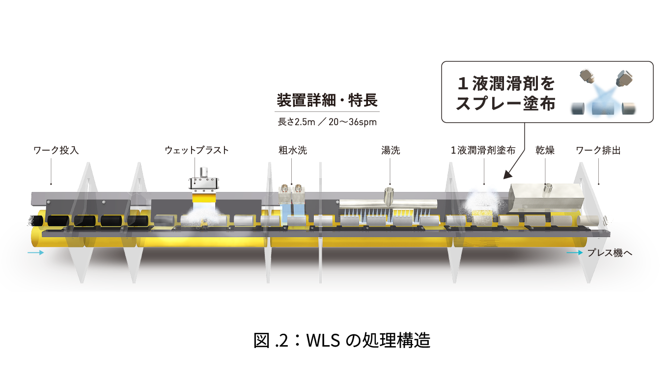 また、図.2で示すようにWLSでは、下地処理と潤滑工程を長さ2.5mの装置1台に集約し、ワークをスラスト搬送することでキズ・打痕が発生しない事も大きな特長です。