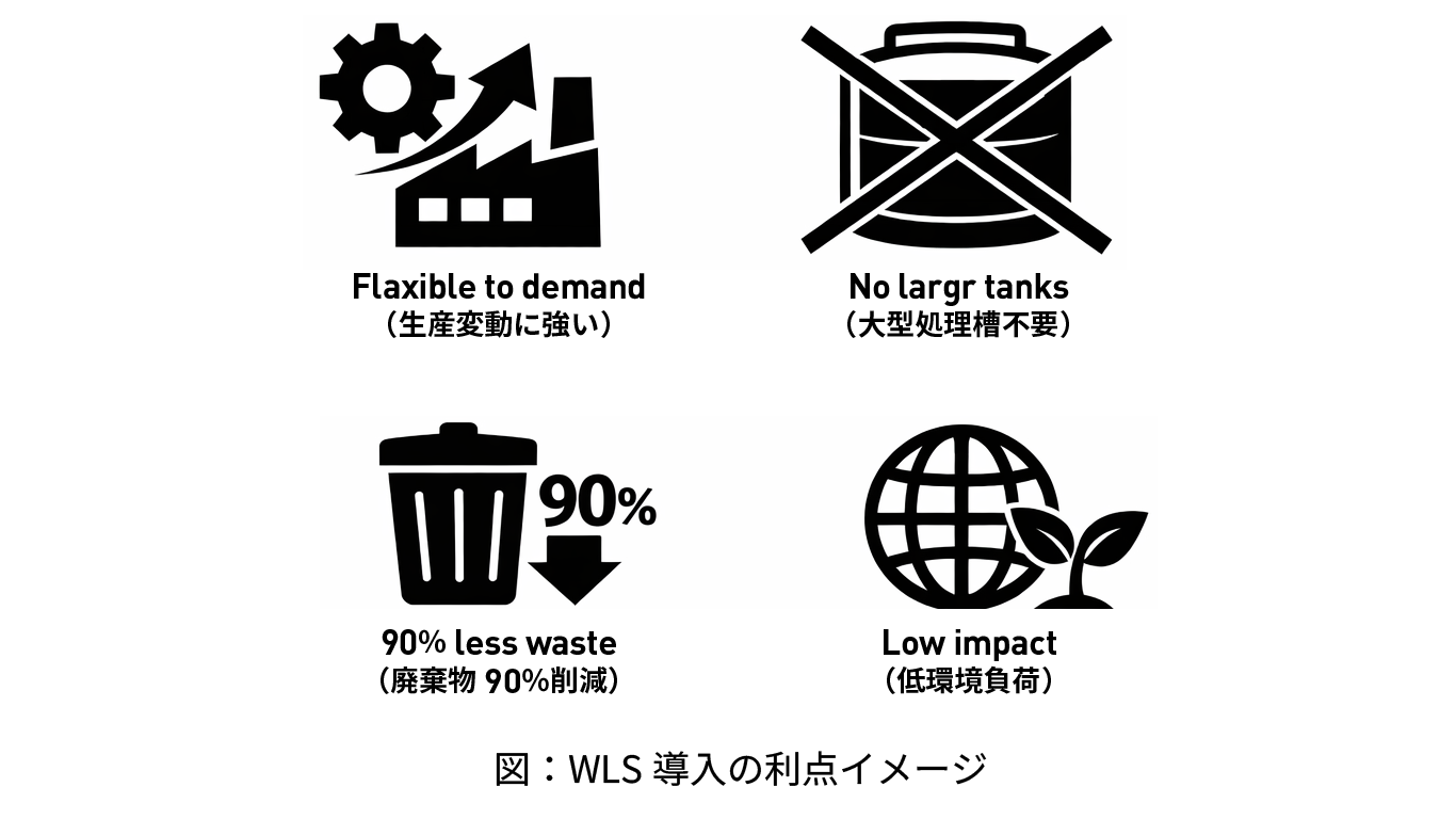 WLSは、単に工程の置き換えだけでなく、生産性や環境負荷の面でも従来工程とは異なるメリットをもたらします。