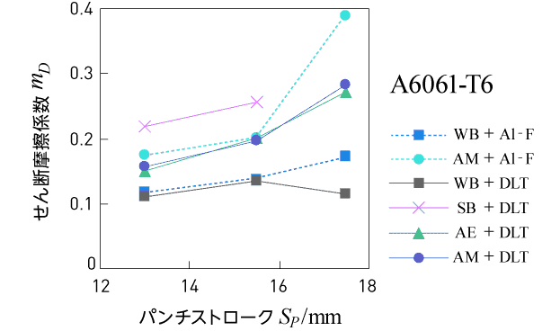 パンチストロークが大きくなると潤滑にはより厳しい条件となり、そのため摩擦係数は増加する傾向にありますが、WBの試験片は、その他と比べて安定した潤滑状態となっています。化成皮膜処理であるAl-F潤滑剤においても、表面処理の違いが現れていて興味深い結果となっています。