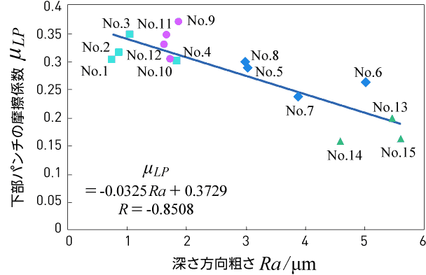 図8 下部パンチの摩擦係数と深さ方向粗さとの関係